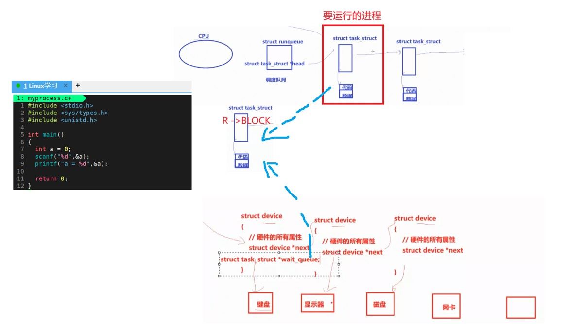 因此我们可以做一个总结:阻塞和运行的本质区别,实际上就是看你这个进程的task_struct在谁提供的队列当中。