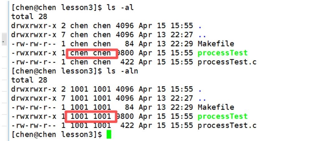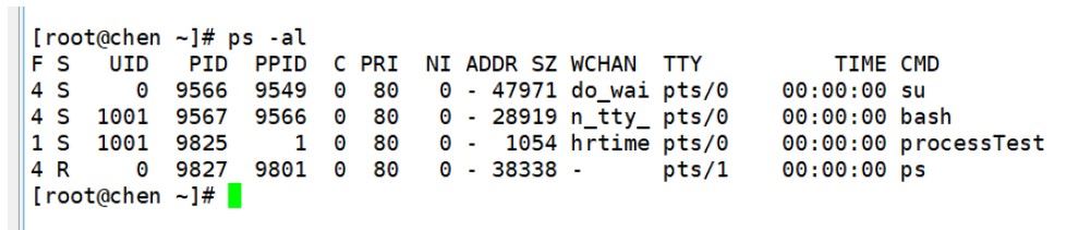 我们先执行了一个程序 peocessTest,然后查看它的进程信息。首先我们来看UID,这代表启动这个程序的用户的名称,因为对于操作系统来说,它会把我们的用户名转化成一个编号以用来区分是谁运行了哪些程序。比如我的用户名 chen ,在操作系统中的编号就是 1001 :