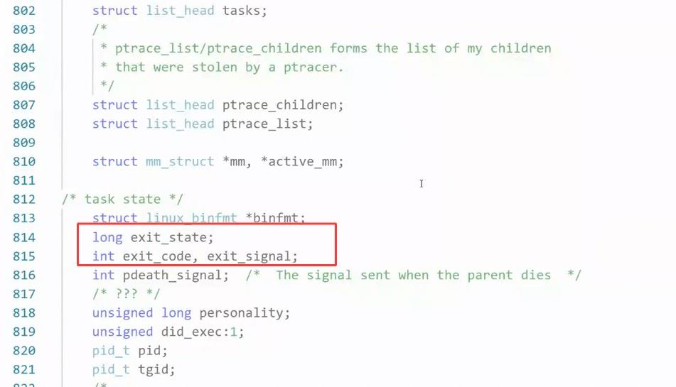 退出信息是被存储在 当前子进程自己的task_struct 结构体里,也就是说子进程虽然结束了,但是它的 task_struct 是一直保留的,这也是我们能在状态查看是看到这个子进程的PID的原因。之所以存储 task_struct,这是为了:父进程未来通过 wait() 或 waitpid() 系统调用时,内核会从这里读取数据并复制给父进程。