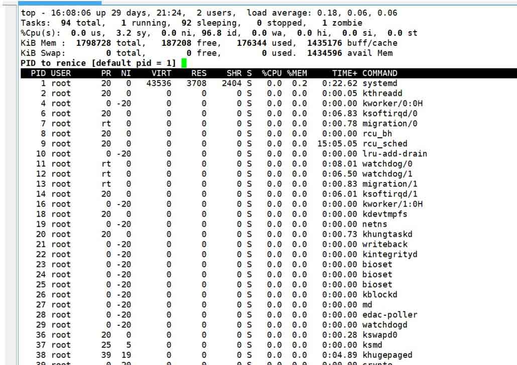 当我们输入top指令的时候,会弹出来当前操作系统内所有正在运行的进程。然后我们再按一下R键,系统会提醒我们要把哪个进程的 NI 值进行修改,接着输入进程的 PID ,然后再输入你想把该进程的优先级改成多少: