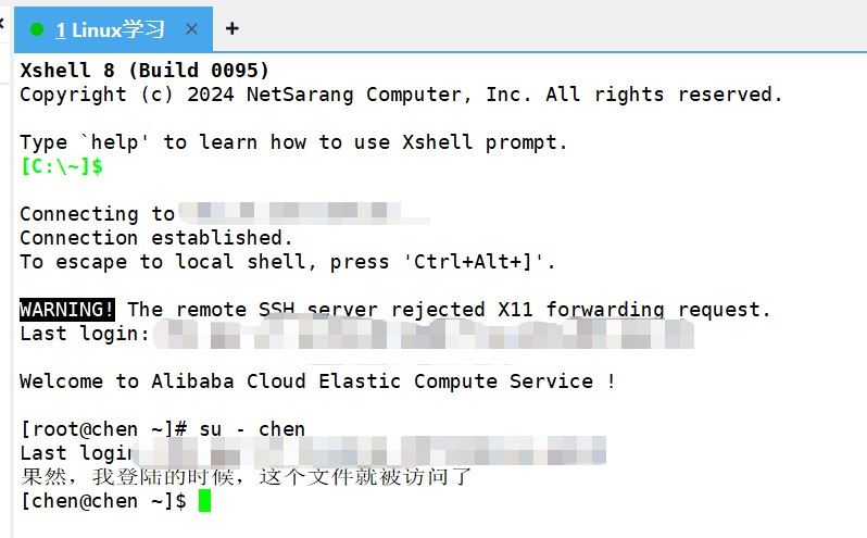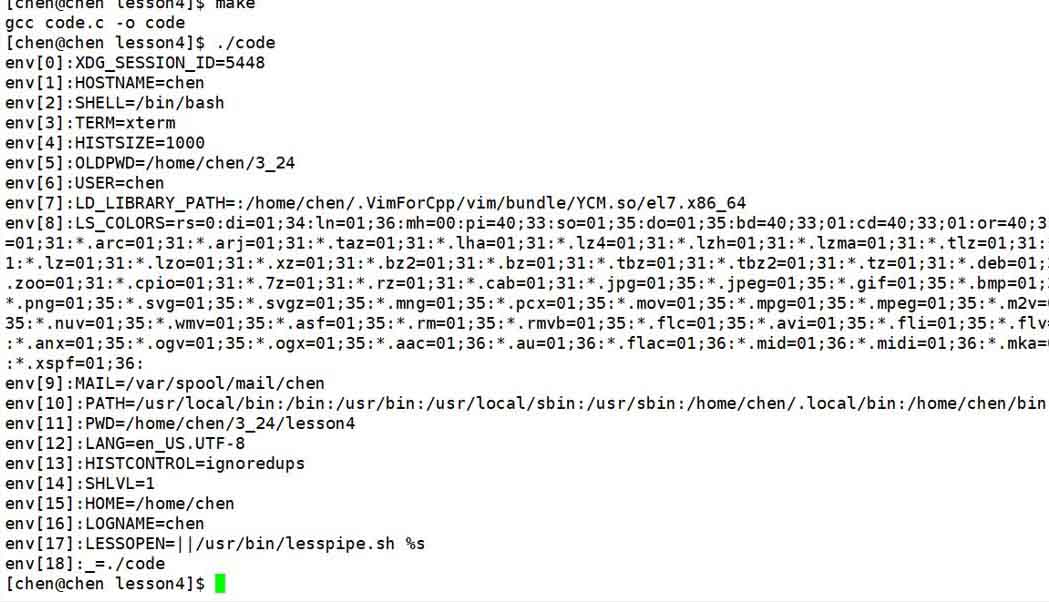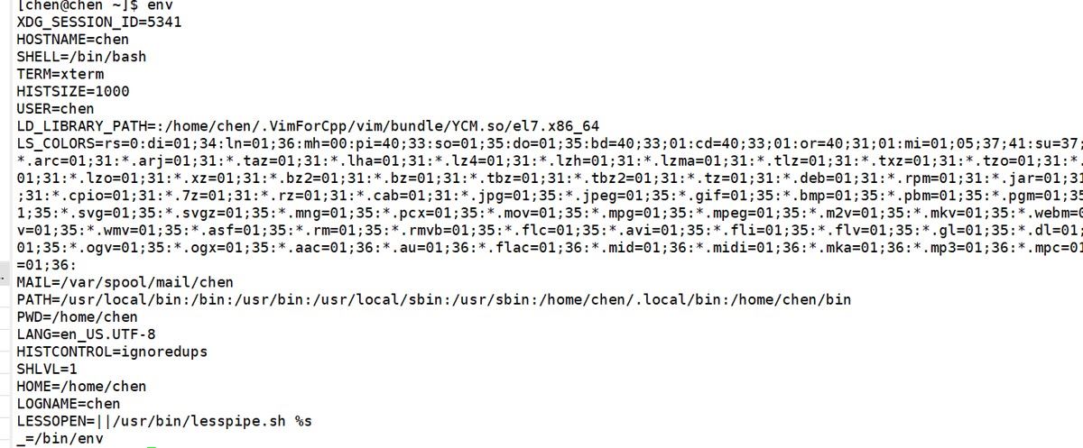 env:这是命令本身,作用是列出当前所有环境变量。SHELL=/bin/bash:指定当前使用的 Shell 解释器为 bash。USER=chen:当前登录的用户名是chen。HOME=/home/chen:当前用户的主目录,也是登录后默认进入的目录。PWD=/home/chen:当前所在的工作目录路径。PATH=/usr/local/bin:/bin:/usr/bin:...:命令搜索路径,Shell 会按顺序在这些目录中查找可执行文件。HOSTNAME=chen:当前主机的名称。TERM=xterm:当前终端的类型,影响命令行的显示和交互。LANG=en_US.UTF-8:系统的语言和字符编码设置,决定输出语言和文本处理方式。HISTSIZE=1000:Shell 历史命令记录的最大条数。HISTCONTROL=ignored:控制历史命令的记录方式,这里表示忽略重复命令。MAIL=/var/spool/mail/chen:用户邮件文件的存储路径。LOGNAME=chen:与USER类似,记录当前登录的用户名。SHLVL=1:当前 Shell 的嵌套层级,1 表示首次登录的 Shell。LESSOPEN=||/usr/bin/lesspipe.sh %s:配置less命令的预处理工具,用于查看压缩文件等。_=/bin/env:上一条执行的命令路径,这里是env命令本身。