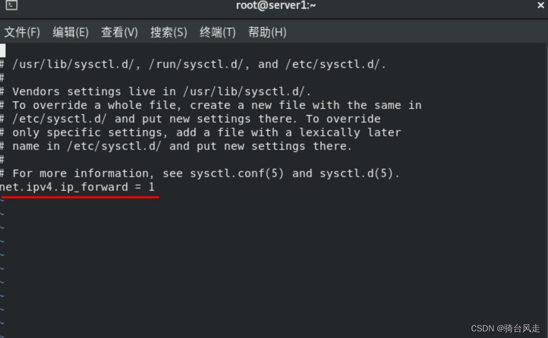 打开内核配置文件,查找net.ipv4.ip_forward = 0,将其修改为net.ipv4.ip_forward = 1,若该行开头有#,将其去掉;若配置文件中没有此项,则在文件最后添加此内容。