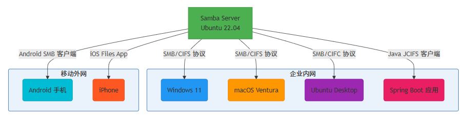 下面这张图展示了典型的 Samba 服务器在网络中的位置及其与各类客户端的关系: