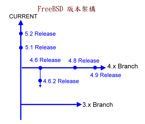 在 FreeBSD 在开发时有一个实验性的版本,以开发新功能为主,称为 CURRENT ,这是主要的分支。当 CURRENT 进入稳定的阶段后,会分支出一个 STABLE 的 Branch,目前 4.x 系列就是一个还在维护的分支。FreeBSD 正式发行的版本称为 RELEASE 版本,推出RELEASE之后会不断的更新该版本以力求稳定性,称之为 STABLE。目前 FreeBSD 5.x 系列尚未建立独立的分支,一旦 5.x Release 成熟稳定后,也会像 4.x 系列一样分支出来,开始对系统效能、稳定度等加以调校。