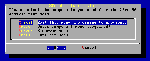 在安装 FreeBSD 时,我们应该己经选择要安装 X Windows 套件,如果您安装 FreeBSD 时并未安装该套件,您可以在开机后执行 /stand/sysinstall 来进入安装时的选单。进入安装画面后,选择 [Configure]->[Distributions]->[XFree86],如图 10-1 所示。