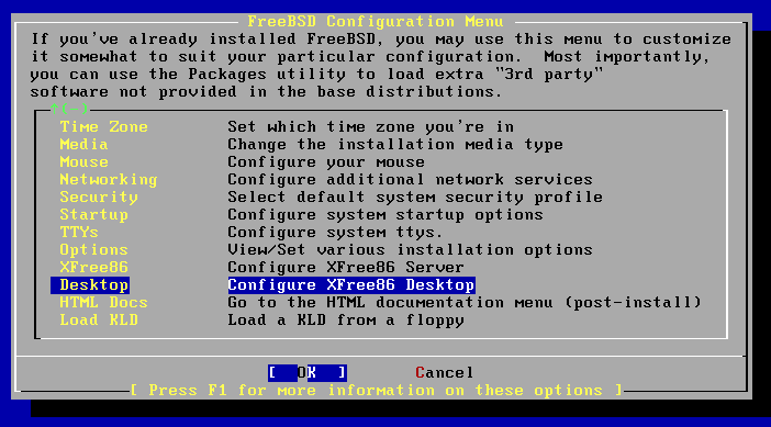 如果您使用 port 来安装 KDE 3,光编译可能就要花上您一天的时间。所以我们还是以 package 来安装 KDE 3 吧。我们同样先执行 /stand/sysinstall,请选择 [Configure] -> [Desktop] 如图 10-3 所示: