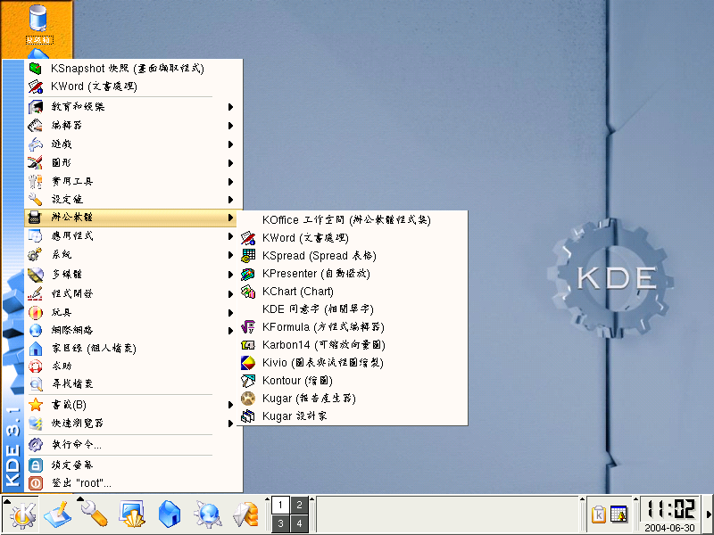 接着我们要将 KDE 中文化,。如果要在 X Window 中看到中文的选单,必须先装中文字型 kcfont (国乔字型)及 arphicttf (文鼎字型),及中文讯息文件 (i18n):