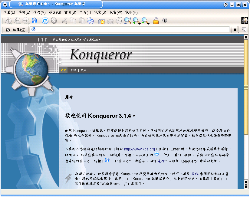 在 KDE3 中有许多的附属软件,从简单的文字编辑器、绘图软件,到常用的办公室软件、浏览器及邮件软件都有。由于是图形接口,您可以自行摸索尝试。KDE 的浏览器是 Konqueror,它的使用接口和 IE 差不多,除了是网页浏览器外,也结合了档案总管的功能,图 10-6 即 Konqueror 的画面: