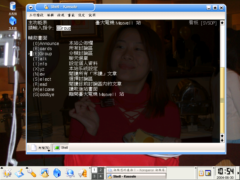 KDE 所附的终端机 Konsole (位于桌面下方有贝壳的黑色屏幕图标) 并已经支持中文的显示,而且还有许多强大的功能,例如我们可以设定终端机背景、字型等,而且操作十分容易。不过由于我们必须要设定环境变量 LC_CTYPE 为 zh_TW.Big5 才可以在 X Window 中输入中文,而这又和以 Konsole 显示中文的设定有所冲突。所以如果您在进入 Konsole 之后无法显示中文,请在 Konsole 中执行下列指令将 LC_CTYPE 设定为 is_IS.ISO8859-1,如果您使用的是 FreeBSD 4.x 请设定为 is_IS.ISO_8859-1: