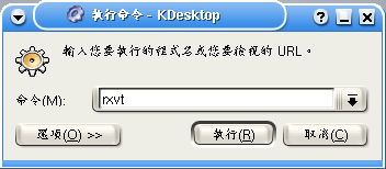 安装完毕启动 X 窗口后,我们可在 [开始选单]->[执行命令] 中,输入 rxvt 来启动中文的终端机。如图 10.9 所示:
