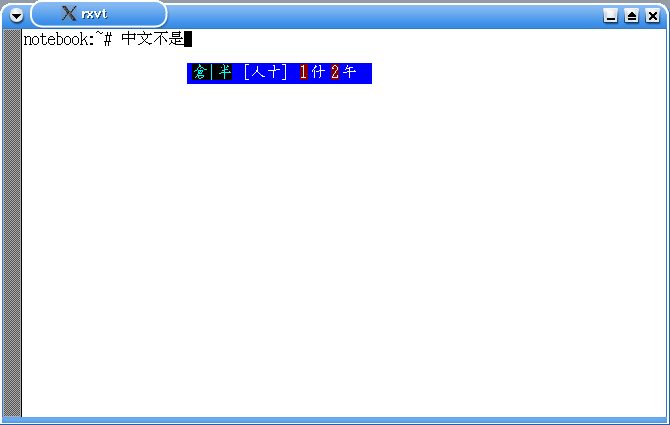修改完后存盘,接着进入 X Window 您将看到输入法的窗口,然后我们就可以执行支持其它软件来输入中文了。例如我们开启 rxvt 的窗口后,就可以使用 Ctrl+Space 来切换中英文输入法。如果您发现开启 rxvt 时,无法切换输入法,请在启动 rxvt 时加上参数 rxvt -im xcin 即可。