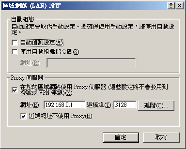 选择上方 [联机] 的标签后,再点选 [局域网络设定],出现下面窗口。接着在Porxy 服务器的部份,在网址的部份输入 proxy server 的网址,连接端口默认值是 3128,接着按确定即可使用浏览器来试试看可不可以使用了: