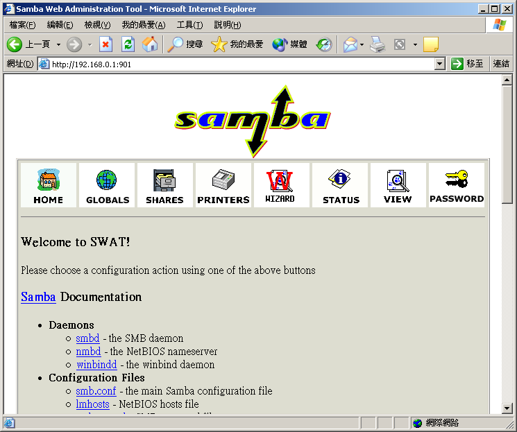 Samba 的组态设定除了可以使用文字编辑软件来修改 smb.conf 外,我们还可以使用浏览器连到 Samba 以图形化接口来设定。