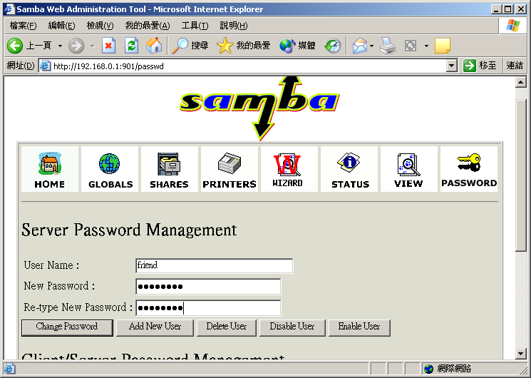 然后就可以使用浏览器以 port 901 连到 Samba Server了。假设 Samba 的 ip 是 192.168.0.1,则输入 http://192.168.0.1:901,被要求输入账号密码时,请输入 root 及其密码。接着出现图 17-2 的画面: