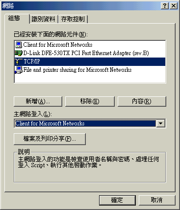 必须要有 Client for Microsoft Networks 及 File and printer sharing for Microsofe Networks。如果要设定使用者名称,在主网络登入请选 Client for Microsoft Networks。