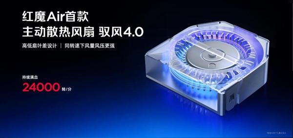 不止于此,红魔11 Air的另一大杀手锏是主动散热,这是唯一内置主动散热风扇的Air手机,这次红魔11 Air升级到了主动散热风扇驭风 4.0,实现了24000转/分的可持续转速,采用高低叶差叶片设计,在机身内部打造全新高效散热通路,将核心热量快速导向风扇散出。