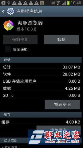 2)在“应用程序管理器”里找到你想要禁止推送广告的软件,如小编选择的海豚浏览器。在海豚浏览器简介里点击“显示通知”。(如下图所示)