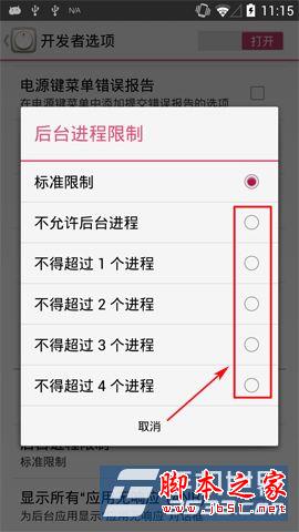 2)进入开发者选项界面后,点击“后台进程限制”按键,然后在显示出的界面中选择不得超过几个进程。这样美图1s的后台进程就限制好了!(如下图所示)