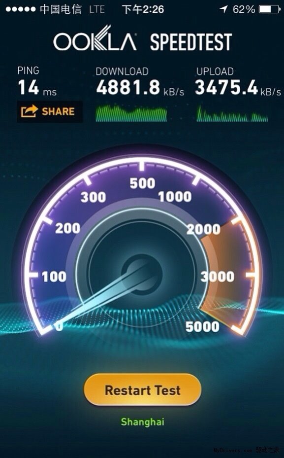 @PCINLIFE曝光的图片显然是来自一部iPhone,其左上角的网络运行商显示为中国电信LTE。具体网速方面,经过测试延迟为14ms,下载速度为4881.8KB/s(大约40MBPs),上传速度为3475.4KB/s(大约28Mbps),这一速度相比TD-LTE网络100Mbps的理论速度还有一定的差距,但在实际测试中能够达到这样的速度实属不易了。