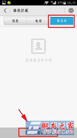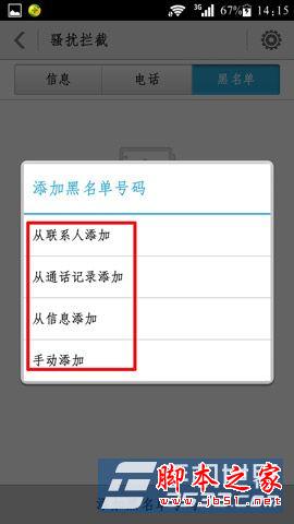 2)选择“黑名单”,最下面可以看到“添加黑名单号码”,可以从联系人、通记录、信息和手动添加黑名单号码。(如下图所示)