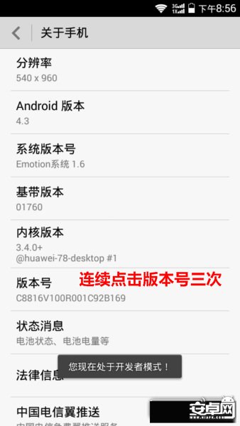 2、打开USB调试:设置--关于手机--版本号(注意,不是系统版本号),连续点击三次,即出现开发人员选项;