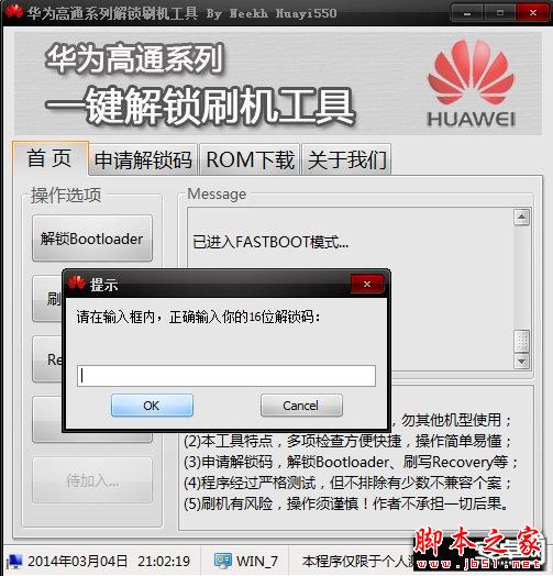 5、数据线连接电脑,打开一键解锁工具,点击“解锁Bootloader”,点击“确定”,出现一个对话框,输入16位解锁码,点击“确定”,一键解锁工具没有任何异常提示,手机顺利重启即解锁成功;如图所示: