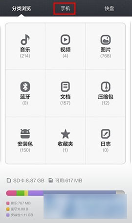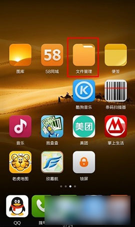 1)首先在主页中找到“文件管理”,然后点击进入“文件管理”,打开之后,我们可以看到“手机”这一栏目,点击进入“手机”。(如下图所示)