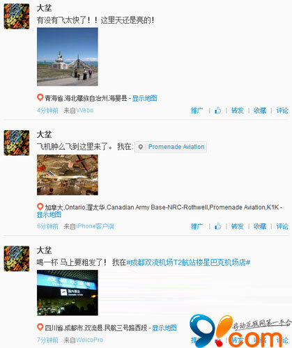 这三条微博分别来自不同的客户端,签到的位置是各不相同的!哈哈,是不是非常高端!这个功能太牛了!可以用N个软件分别“跑步”!比超人还超人!