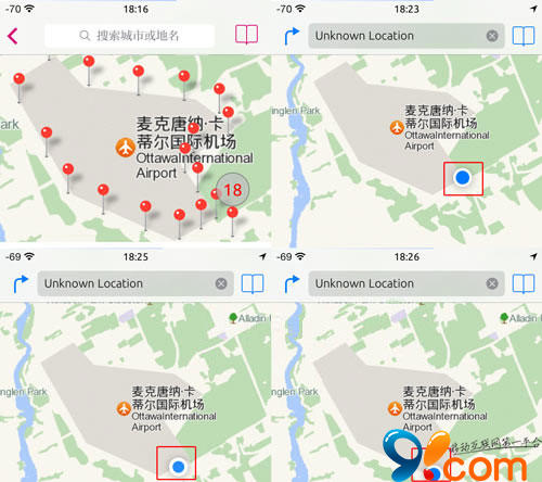 进入全局位置自定义菜单,找个适合跑步的地方。加拿大的麦克唐纳.卡蒂尔国际机场不错!围着这个机场,每在一个位置长按一次,即确定一个坐标。标记的时候会显示编号,标好后,点击标记也会显示编号。我依次标上18个坐标,保存以后,我们先进手机自带“地图”看一下。注意查看各图上的时间和位置情况。位置是随着时间变换变换的。