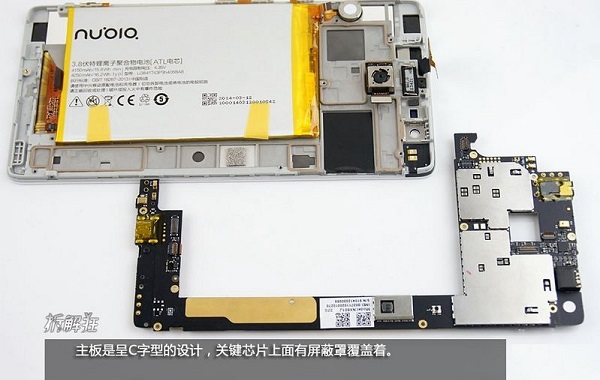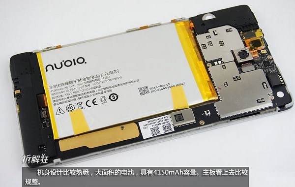 努比亚X6机身内部设计比较常见,布局与大多数智能机内部相似,采用了大面积的电池,内置有4150mAh大容量,主板看上去比较规整,如下图所示: