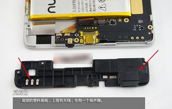 下面先来看一个细节,在努比亚X6机身内部底部的塑料盖板上有天线,也有一个扬声器,如下图所示: