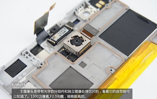 解下来,我们先将容易拆卸的摄像头小部件取下来,努比亚X6后置有1300万像素F2.0大光圈摄像头,该摄像头带有光学防抖组件和独立图形处理芯片,拍照上号称单片体验,拍照上规格还是很高的。