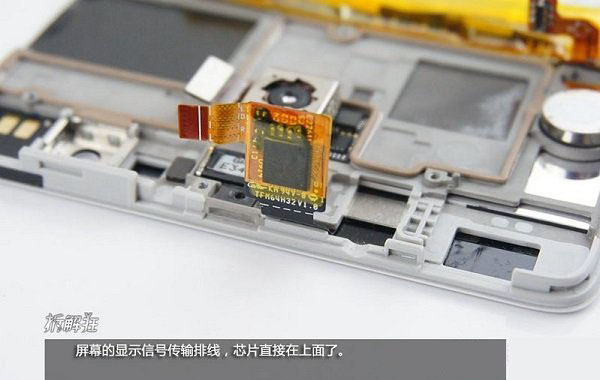 拆解下来主板后,接下来看看屏幕面板上还剩下些什么。首先下图看到的是屏幕的显示信号传输排线,芯片直接在上面了。