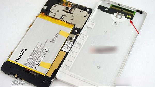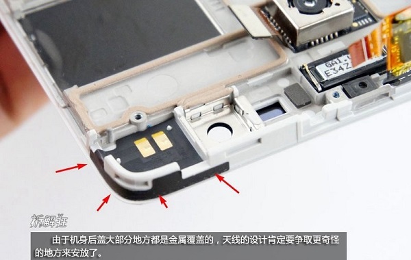 由于机身后盖大部分地方都是金属覆盖的,天线的设计肯定要争取更奇怪的地方来安放,下图为努比亚X6内部天线设计特写。