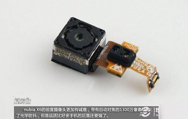 图为拆卸下来的努比亚X6前置摄像头,该机前置了1300万像素带有自动对焦功能的摄像头。在目前的智能手机,鲜有能够搭载1300万高像素前置摄像头的产品,可以说,该机搭载的前置摄像头比很多千元机搭载的后置摄像头还要强。