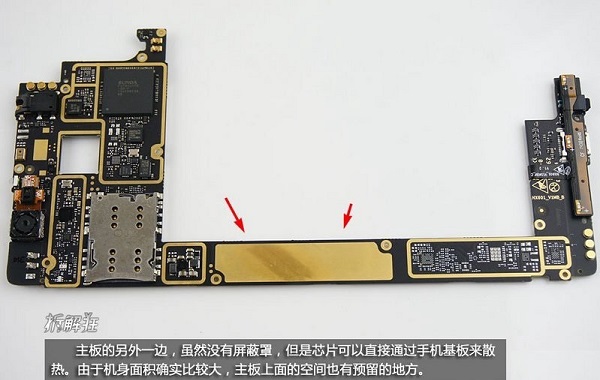 努比亚X6主板的另外一边虽然没有屏蔽罩,但是芯片可以直接通过手机基板来散热。由于机身面积确实比较大,主板上面的空间也有预留的地方,如图。