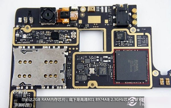 下面是芯片部分了,努比亚X6主板上集成了尔必达2GB RAM内存芯片,另外在内存芯片的内部下方还集成有2.3Ghz高通801(8974AB)顶级四核处理器芯片。