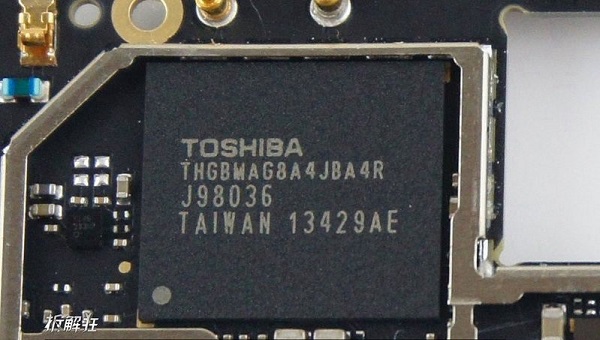 努比亚X6内置32GB大容量存储空间,在其内部的主板芯片上,我们可以看到,其为出自东芝的32GB闪存芯片。