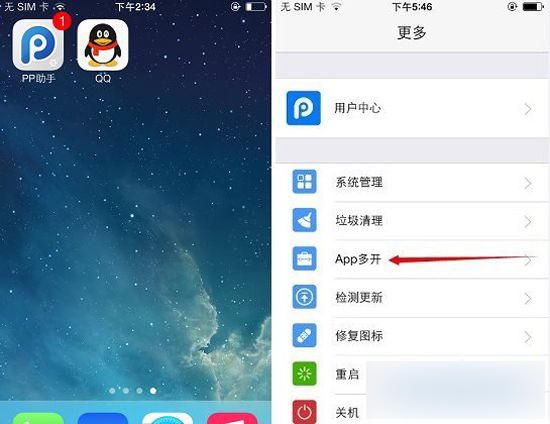 1)下载安装并打开IOS设备上的【PP助手】,点击菜单栏【更多】--【App多开】。(如下图)