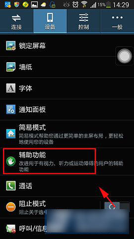 1)首打开三星Note2的【设置】,然后进入【设备】栏。(如下图所示)