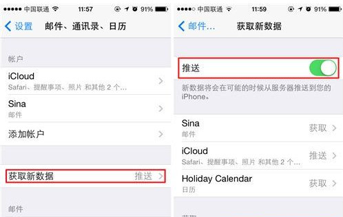 2)进入后点击【获取新数据】,开启【推送】选项。