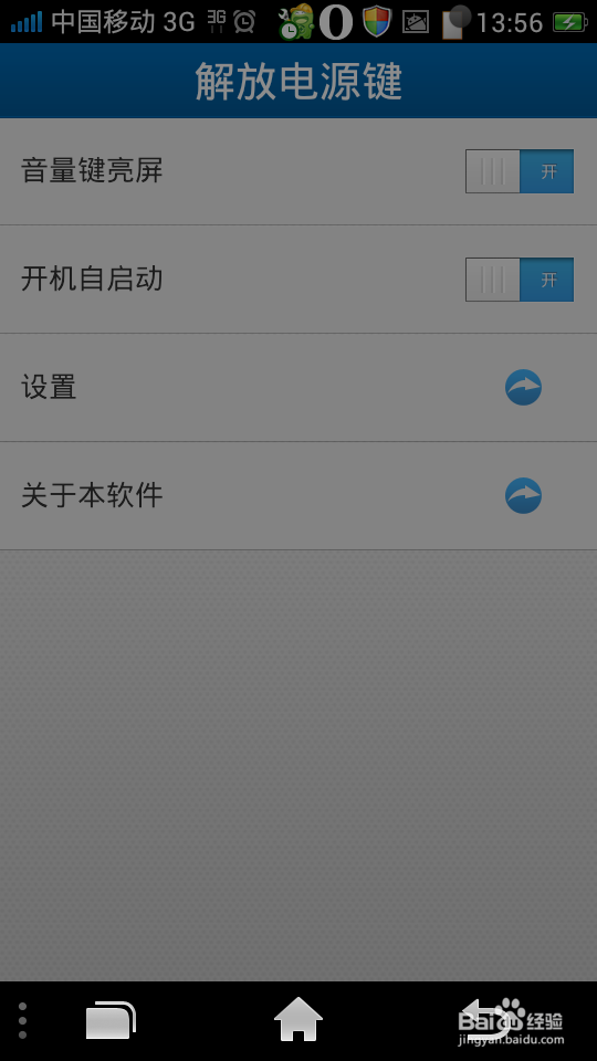 安装到手机,打开软件。打开“音量键亮屏”和“开机自启动”。