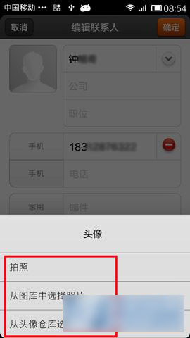 2)在编辑联系人界面中点击小伙伴的头像,根据所需我们可以从【图库】中选择以有的相片,或者直接跟小伙伴【拍照】(如下图所示)