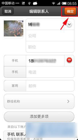 3)小编以【图库】为例,随便选取了一张图片点击【确定】,返回编辑联系人后再次【确定】(如下图所示)