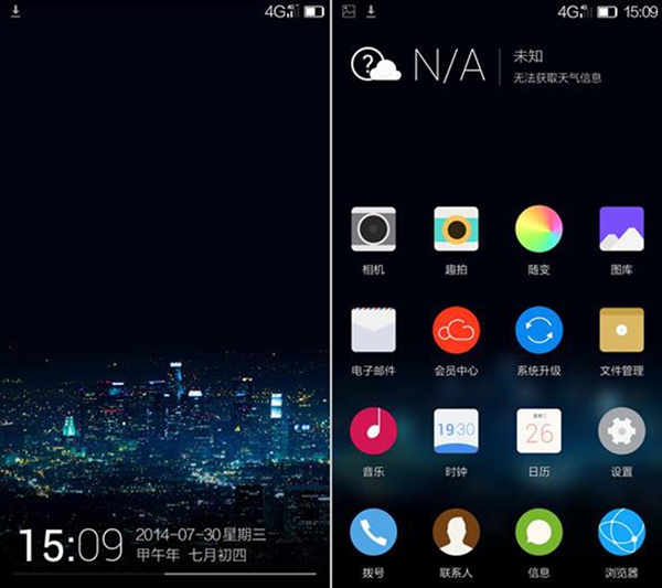 ELIFE S5.5L新版的Amigo OS2.0也是采用了向上滑动解锁的方式,主界面的图标显得更加扁平,而且也是沿用了毛玻璃透明效果的壁纸可视化处理。