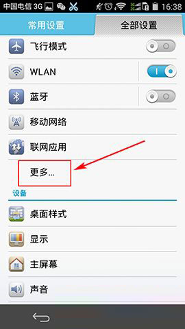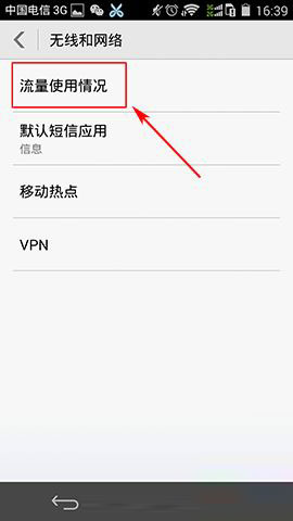 1)找并并打开华为荣耀6手机【设置】,在全部设置面板中点击【更多】,找到【无线和网络】点击【流量使用情况】。(如下图所示)