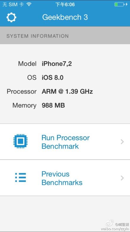 根据臧智渊提供的检测截图,4.7英寸的iPhone6内存依旧为1GB。同时截图还显示苹果iPhone6采用的20nm工艺的A8 SoC处理器主频为1.39GHz。
