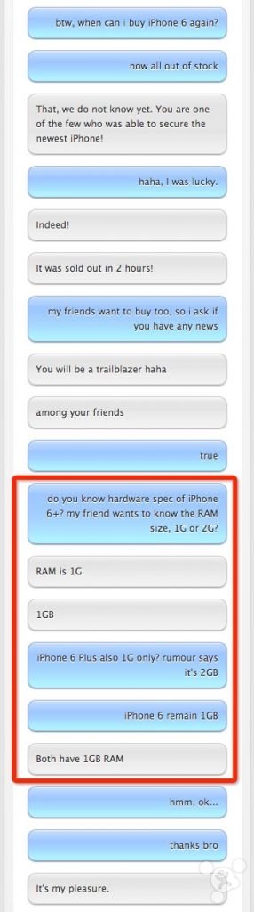 4.7英寸版本如此,那5.5英寸的iPhone6 Plus呢?威锋网网友近日在论坛分享与苹果客服沟通的截图,苹果客服在回答用户关于内存的问题时表示“Both have 1GB RAM”。