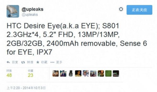 值得一提的是,爆料大神@upleaks透露,HTC Desire Eye将采用5.2英寸FHD(1080×1920像素)大屏,搭载2.3GHz高通骁龙801四核处理器,配备2GB RAM和32GB机身内存,以及2400mAh电池(可拆卸)。