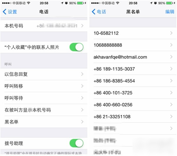 注:所有的黑名单电话均可在“设置-电话”界面里点击“黑名单”进入后查看到。